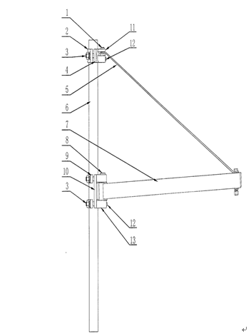 這簡易種微型電動葫蘆支架的特征是:上掛耳(11)和下掛耳(13)上對應(yīng)設(shè)有固定上固定軸銷(1)和下固定軸銷(8)的緊固螺絲(12)。支撐管組件(7)與加強(qiáng)條(5)的連接端設(shè)有支撐管套(18)。立柱(6)由圓鋼或圓管制成,直徑不小于48毫米,圓管的壁厚不小于4毫米。上固定座的高點(diǎn)與下固定座的低點(diǎn)之間的距離為450毫米。