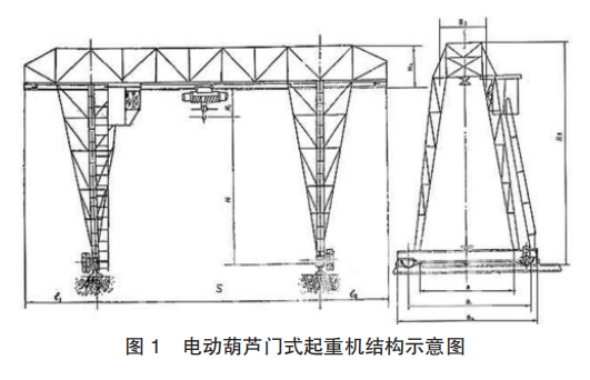 電動(dòng)葫蘆門式起重機(jī)具有場地利用率高、作業(yè)范圍大、適應(yīng)面廣、通用性強(qiáng)等優(yōu)點(diǎn);同時(shí)因其結(jié)構(gòu)簡單等導(dǎo)致其整體穩(wěn)定性相對(duì)較差、起升和運(yùn)行晃動(dòng)較大,一旦安全裝置失效極易發(fā)生事故。圖 1 為電動(dòng)葫蘆門式起重機(jī)結(jié)構(gòu)示意圖。