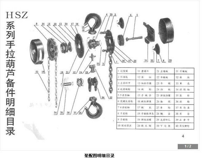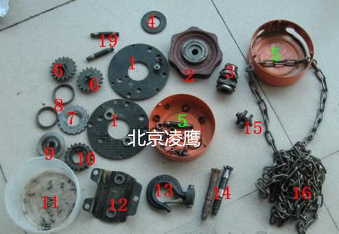 下面介紹一下手拉葫蘆的各部件名稱對照表,1位側(cè)板,2為手鏈輪,3位起重鏈輪,4位摩擦片,5位外殼,6位四齒短軸,7為棘輪,8位軸承外套,9位摩擦片座,10位花鍵孔齒輪,11為軸承滾珠,12外側(cè)板,13固定鉤,14五尺長軸,15起重鏈靠輪,16手拉鏈,17起重鏈,18起重吊鉤,9固定軸。
