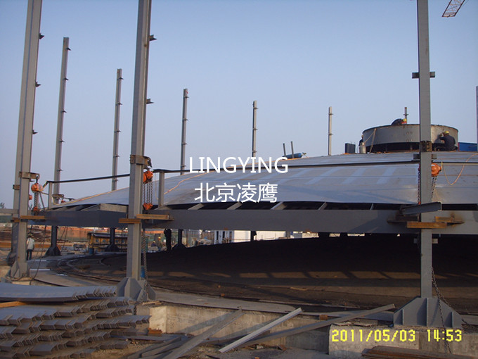 立拱頂胎架(如為拱頂罐),組焊儲罐頂板,在頂板上預(yù)留提升柱天窗。