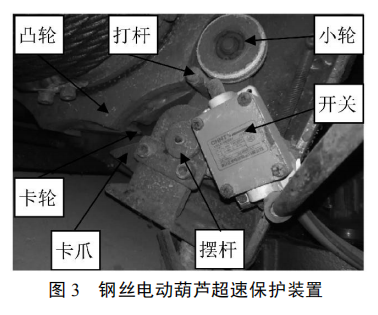鋼絲繩電動葫蘆的超速保護裝置一般只能安裝在電動葫蘆內(nèi)部,比如測速的光電傳感器安裝在電動葫蘆減速器的齒輪上;或者是在卷筒上安裝一套機構(見圖 3),擺桿一頭是在凸輪上轉(zhuǎn)動的小輪,另一頭是卡爪。卷筒以正常速度轉(zhuǎn)動時,小輪、打桿和卡爪隨著凸輪擺動,此時擺動的幅度較小,打桿不會打到開關且卡爪不會碰到安裝在卷筒上的卡輪。當轉(zhuǎn)速越來越快時擺桿的擺動幅度變大,打桿和卡爪的擺動幅度也跟著變大,當超速時打桿觸動開關,切斷電機電源使電動葫蘆制動器動作。該機構有二次保護作用,即當電動葫蘆制動器失效轉(zhuǎn)速繼續(xù)增加時,卡爪擺動幅度將大到使其卡住卡輪,實現(xiàn)第二制動,完成超速保護。