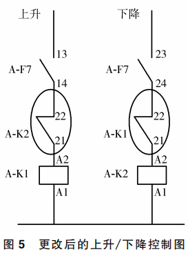 建議:由于橋機電動葫蘆一般在檢修期使用較多,平時多為停止?fàn)顟B(tài),其廠房內(nèi)振動較大,所以要注意日常維護,檢查元器件是否動作良好,有無銹蝕、接線松動等現(xiàn)場,并及時處理。更改其上升、下降控制圖如下: