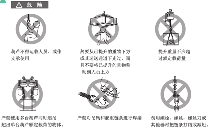 環(huán)鏈電動葫蘆適用于在正常的工作條件下,垂直方向的載荷提升,而不能用于運載人。環(huán)鏈電動葫蘆的禁用準則如下: