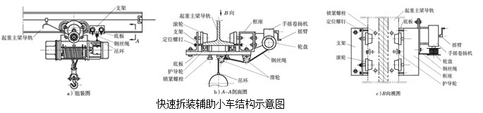 為克服現(xiàn)有技術(shù)的上述缺陷,研發(fā)了一種電動(dòng)葫蘆起重機(jī)快速拆裝輔助小車。該裝置利用滾輪與手搖卷?yè)P(yáng)機(jī),提供一種省力、省時(shí)、拆裝安全方便的方式。
