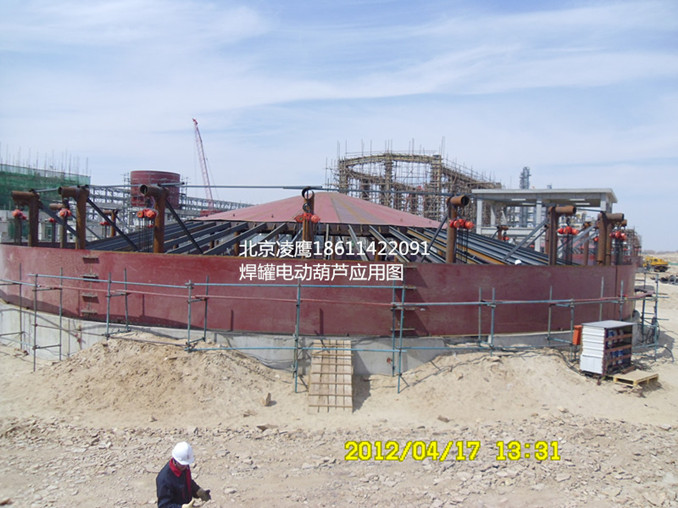 大型儲罐廣泛應用于工業(yè)生產(chǎn)各個行業(yè),但在安裝過程中經(jīng)常會碰到位置狹小、空間不足等問題,無法采用大型起重機直接吊裝。結(jié)合多年施工經(jīng)驗,采用電動葫蘆邊柱提升倒裝法施工,克服了上述問題。焊罐電動葫蘆在大型儲罐應用中的安全措施如下: