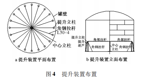 電動(dòng)葫蘆提升倒裝法的施工裝置主要由電動(dòng)葫蘆、中心立柱、膨脹圈、斜撐以及調(diào)節(jié)裝置等組成,提升裝置如圖4所示。在儲罐內(nèi)部距罐壁500mm左右的同心圓上均布20個(gè)10t倒鏈,提升電動(dòng)葫蘆固定在倒裝立柱上。倒裝立柱用159*8鋼管制成,高3.2m,立柱上端吊耳、底座及筋板均用16mm鋼板制作而成。在立柱3/4高度位置3個(gè)方向安裝3根斜撐。斜撐之間的夾角及斜撐與罐底的夾角均以450為宜,罐中心安裝1根中心立柱,用于把每個(gè)提升立柱連在一起,形成一個(gè)整體。