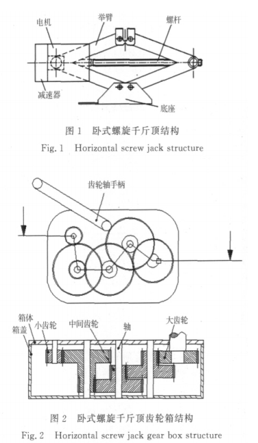 新型臥式螺旋千斤頂系統(tǒng)由電機(jī)、減速箱、上下舉臂、固定板和底座組成,且可實(shí)現(xiàn)電動(dòng)與手動(dòng)的快速轉(zhuǎn)換。電動(dòng)時(shí),電機(jī)可正反轉(zhuǎn)動(dòng),通過1組外嚙合圓柱齒輪減速后帶動(dòng)螺桿轉(zhuǎn)動(dòng),可實(shí)現(xiàn)千斤頂?shù)捻斊?、回落過程。手動(dòng)時(shí),可通過在齒輪箱定位孔上安裝手柄,通過首要手柄架,帶動(dòng)螺桿轉(zhuǎn)動(dòng),電動(dòng)與手動(dòng)的快速轉(zhuǎn)換通過齒輪軸手柄裝入和取出實(shí)現(xiàn),結(jié)構(gòu)簡(jiǎn)單,切換可靠。