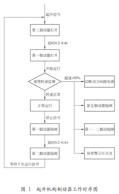 上述 3 套制動器裝置均能夠單獨可靠地支撐額定載荷,其中第三制動器直接作用于卷筒軸,在工作制動器出現(xiàn)故障、電機斷軸或減速器中出現(xiàn)故障時能夠可靠地支撐載荷。此設(shè)計目的是在安全冗余較為嚴(yán)苛的場合下為用戶提供一種更加安全有效的起重設(shè)備。制動器具體工作時序如圖 1 所示。