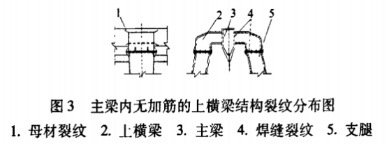 上橫梁與主梁連接處在焊縫及母材上都出現過裂紋,如圖3所示。主要原因是主梁內部與上橫梁腹板連接對應位置缺少加勁肋板,造成主梁與上橫梁之間傳力不暢,腹板局部穩(wěn)定性不足,加上焊接應力集中,致使在連接部位造成疲勞裂紋。