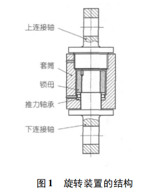 鋼絲繩旋轉(zhuǎn)裝置的結(jié)構(gòu)見圖1,上連接軸1與套筒2通過螺紋連接,并用銷釘鎖死形成一體,與此類似下連接軸5穿入套筒內(nèi)后,與套筒內(nèi)的鎖母3旋合并鎖死,這樣整個裝置就分為上下兩部分。這兩部份通過中間的推力軸承4連接起來。該裝置最大的特點(diǎn)在于,由于有推力軸承存在,上下兩部份可以獨(dú)立地轉(zhuǎn)動,即在上連接軸發(fā)生旋轉(zhuǎn)時,下連接軸保持不動,這正滿足了解決鋼絲繩“打麻花”問題的要求。