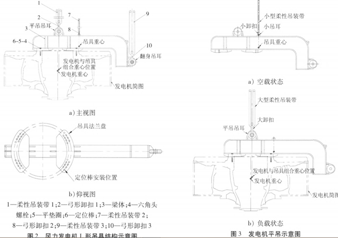 風(fēng)力發(fā)電L形平吊與翻轉(zhuǎn)吊具主要有柔性吊裝帶1、弓形卸扣1、梁體、六角頭螺栓、六角頭螺栓、平墊圈、定位棒、柔性吊裝帶2、弓形卸扣2、柔性吊裝帶3、弓形卸扣3等零部件組成。此吊具具有平吊和翻轉(zhuǎn)兩種吊裝功能,發(fā)電機(jī)裝車、卸車時(shí)可用此吊具進(jìn)行平吊吊運(yùn),上實(shí)驗(yàn)臺(tái)做試驗(yàn)時(shí)可用此吊具進(jìn)行翻轉(zhuǎn),結(jié)構(gòu)簡(jiǎn)單,操作方便,翻身快捷。