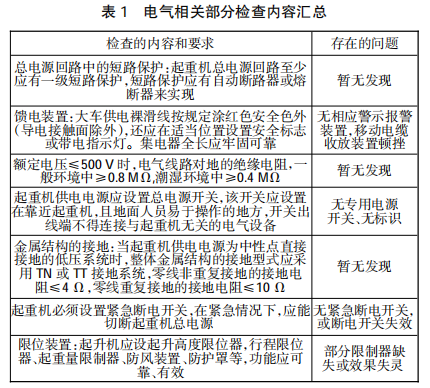 按照企業(yè)特種設(shè)備檢查要求,對(duì)筒倉頂、焦?fàn)t兩 端、篩焦樓、各風(fēng)機(jī)房及廠房?jī)?nèi)電動(dòng)葫蘆設(shè)備進(jìn)行了 檢查,對(duì)所發(fā)現(xiàn)的問題進(jìn)行統(tǒng)計(jì)和歸納,具體如表 1 所示,其他符合要求的項(xiàng)目未一一列出。