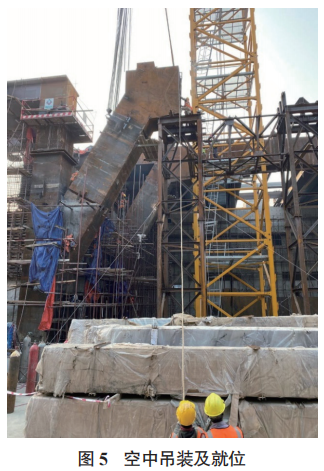 (4)起扳和就位:起板過(guò)程需要具有上崗證書(shū)的起重工通過(guò)對(duì)講機(jī)進(jìn)行良好的溝通,注意查看吊鉤的重心和節(jié)點(diǎn)的重心是否在一條線上,避免起吊過(guò)程中出現(xiàn)大的晃動(dòng)。起重工調(diào)整手拉葫蘆(伸長(zhǎng)手拉葫蘆),使斜柱底段逐漸下落,調(diào)整至就位位形的繩長(zhǎng)時(shí),采用全站儀測(cè)量斜柱頂部,保證水平誤差在±10mm 以內(nèi);然后緩慢吊裝就位,就位以后微調(diào)手拉葫蘆,保證對(duì)接縫順利連接,頂部處于水平狀態(tài),誤差在±3mm 以內(nèi),然后停止調(diào)整,對(duì)斜柱進(jìn)行焊接加固?,F(xiàn)場(chǎng)實(shí)施如圖5所示。