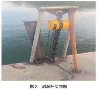3、制作手拉葫蘆支撐:在測深桿左右兩側(cè)分社兩根無縫鋼管,頂部加一根短橫桿,橫桿下段中部焊接手拉葫蘆掛口,完成后焊接一根斜長支撐桿,所有桿件連接均采用焊接。