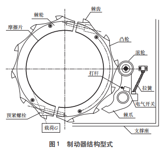 目前電動(dòng)葫蘆起升機(jī)構(gòu)常采用棘輪棘爪式機(jī)構(gòu)作為安全制動(dòng)器,棘輪布置在卷筒上,棘爪布置在葫蘆外殼支座上。當(dāng)電動(dòng)葫蘆在提升負(fù)載過(guò)程中出現(xiàn)斷齒、斷軸等導(dǎo)致負(fù)載失速下降時(shí),棘爪與棘輪嚙合,通過(guò)摩擦制動(dòng)方式實(shí)現(xiàn)超速保護(hù)功能。