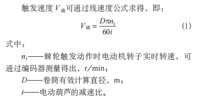 測(cè)試時(shí),將電動(dòng)葫蘆的電機(jī)制動(dòng)輪的鎖緊螺母調(diào)松,使其處于松閘狀態(tài)。安全制動(dòng)器觸發(fā)速度定義為卷筒加速下降,引起棘輪棘爪嚙合時(shí)鋼絲繩繞出卷筒的線(xiàn)速度 ( 單位為 m/s)。并把相關(guān)數(shù)據(jù)代入式(1),得到電動(dòng)葫蘆安全制動(dòng)器的觸發(fā)速度 V 動(dòng)。