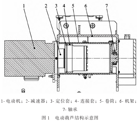電動葫蘆由多個結(jié)構(gòu)部件組成,每個部件在設(shè)備的運行中都扮演著至關(guān)重要的角色。電動葫蘆的基本組成包括電動機、減速器、卷筒、定位套、連接套、軸承、機架等(圖 1)。減速器的功能是把電動機的高轉(zhuǎn)速小轉(zhuǎn)矩轉(zhuǎn)換成低轉(zhuǎn)速大轉(zhuǎn)矩輸出,以帶動卷筒。鋼絲繩纏繞在卷筒上,利用卷筒的轉(zhuǎn)動完成負載的升降。定位套及連接套用來保證各零部件間的連接準確,避免出現(xiàn)傳動誤差或零部件松脫現(xiàn)象。