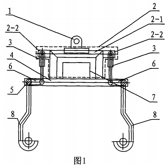 這種吊索具由吊環(huán)(1)、框架體(2)、兩個(gè)液壓油缸(3)、兩個(gè)橫梁(4)、兩個(gè)吊鉤軸(5)、兩個(gè)連動(dòng)梁(6)、液壓泵(7)和四個(gè)吊鉤(8)組成,其特征在于:所述吊環(huán)(1)的下端面固接在框架體(2)的上端面上,所述兩個(gè)橫梁(4)水平設(shè)置在框架體(2)的下方,所述所述兩個(gè)橫梁(4)水平設(shè)置在框架體(2)下端面上,所述兩個(gè)液壓油軸缸(3)的缸體分別固接在框架體(2)的兩側(cè),所述兩個(gè)液壓油缸(3)的連桿下端分別與連動(dòng)梁(6)的一端連接,所述兩個(gè)吊鉤軸(5)與兩個(gè)橫梁(4)構(gòu)成四框體,所述兩個(gè)橫梁(4)的兩端分別與吊鉤軸(5)轉(zhuǎn)動(dòng)連接,所述兩個(gè)吊鉤軸(5)的中部分別與連動(dòng)梁(6)的另一端連接,每個(gè)吊鉤軸(5)的兩端分別固接有吊鉤(8),所述液壓泵(7)位于框架體系(2)內(nèi)并與框架體(2)固接,所述兩個(gè)液壓軸(3)通過(guò)油管分別與液壓泵(7)連通。
