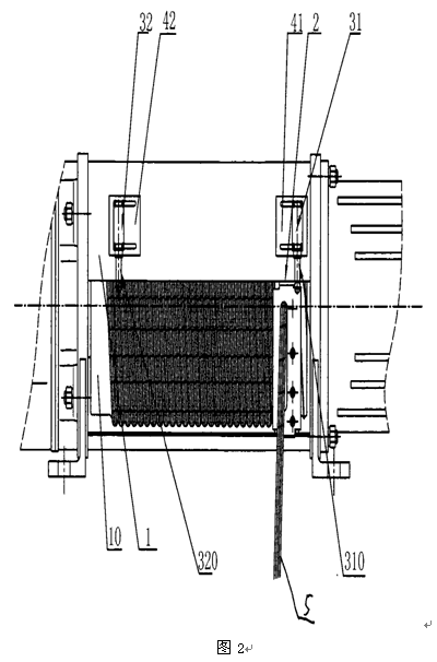 (1)包括位于卷筒外殼1的開口10處的導繩器2、導繩器2可沿著開口10左右移動,在導繩器2的移動區(qū)域相對應的卷筒外殼1兩端附近設置有下止點限位行程開關32、上止點限位行程開關31,下止點限位行程開關32、上止點限位行程開關31分別通過左開關固定板42、右開關固定板41安裝到卷筒外殼1上,下止點限位行程開關32、上止點限位行程開關31分別串聯(lián)到鋼絲繩電動葫蘆的控制回路中,下止點限位行程開關32、上止點限位行程開關31分別具有下止點撓性拔桿320、上止點撓性拔桿310。