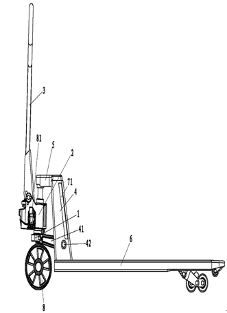 備注:下圖為應(yīng)用靜音技術(shù)的手動(dòng)液壓搬運(yùn)車的整體結(jié)構(gòu)示意圖。其中1、止推板,2、油缸體,3、手柄,4、背板,5、頂板,6、貨叉,8、行走輪,41、轉(zhuǎn)桿,42、圓棒,71、第一吸音件,81、旋轉(zhuǎn)件。