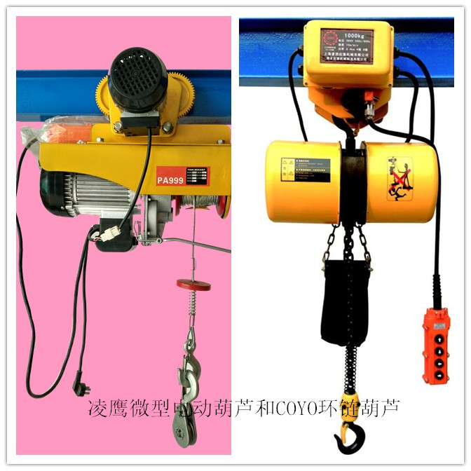 微型電動葫蘆也可以分為鋼絲繩電動葫蘆和環(huán)鏈電動葫蘆兩種。鋼絲繩電動葫蘆就是上面說到的PA型電動葫蘆。而環(huán)鏈微型電動葫蘆,指的是COYO型環(huán)鏈電動葫蘆。